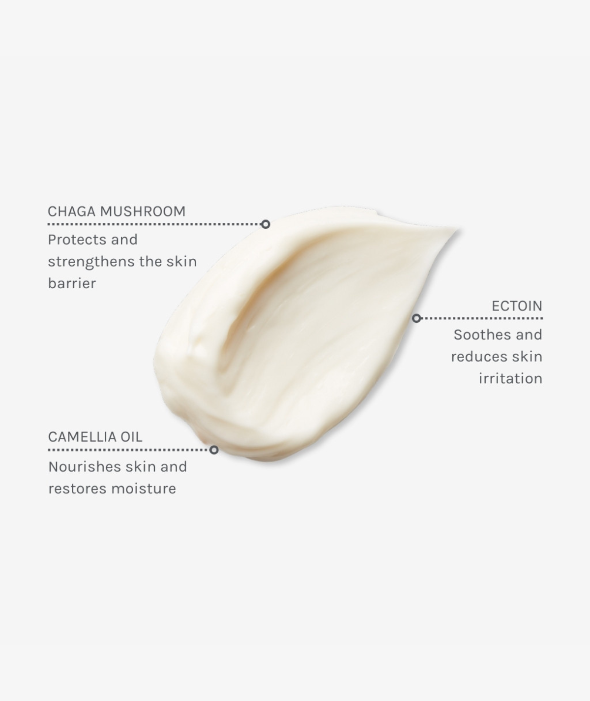 Calm your skin. This soothing organic moisturiser for sensitive skin helps to reduce skin stress, restore and calm skin down whilst reinforcing the skin barrier, protecting it from sensitivity. Chaga mushrooms help to boost skin resilience, whilst Ectoin and Camellia Oil help to reduce redness, protect skin, restore moisture and bring relief to dry, flaky and sensitive skin.